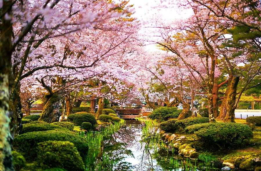 In april kun je hier kersenbloesem zien, terwijl je van eind november tot begin december getrakteerd wordt op de prachtige rode, gele en oranje herfstkleuren. Opvallend zijn de bomen die in de herfst en winter een traditionele puntvormige kap hebben om ze te beschermen tegen de sneeuw.