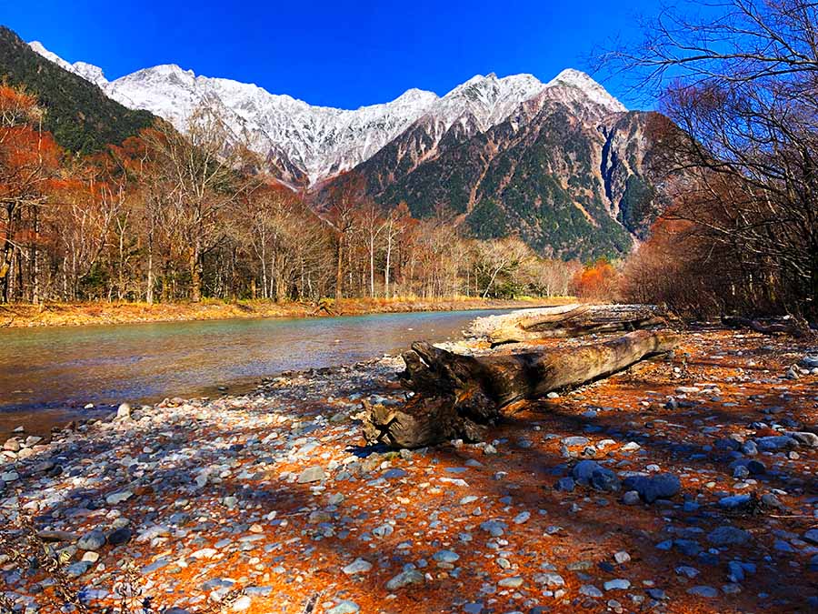 De sprankelende Azusa-rivier kronkelt door het pure landschap en grenst aan een bergketen die in vuur en vlam lijkt te staan. Het brede palet herfstkleuren is volop vertegenwoordigd, en doet deze busreis door de het onbewoonde deel van de Japanse Alpen als een droom voelen.