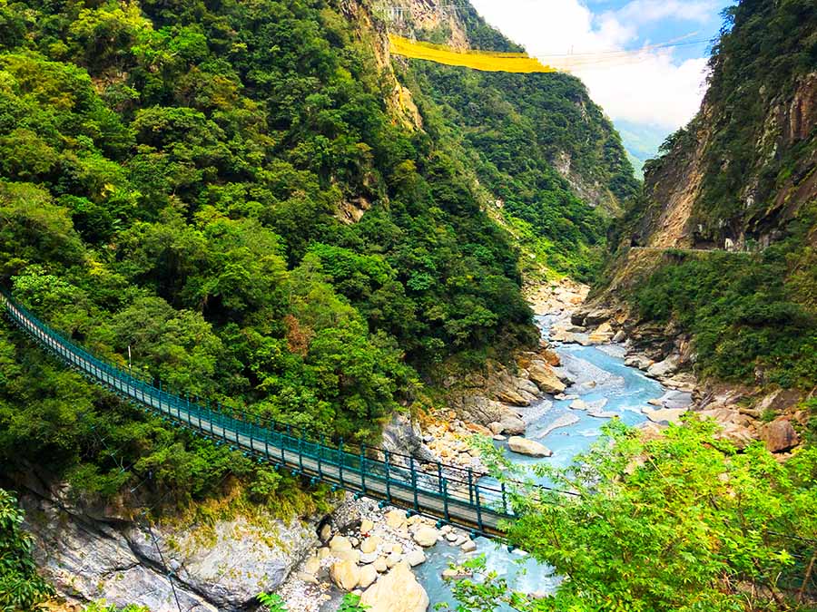 Behalve de Swallow Grotte is er nog iets mooiers als je het mij vraagt. Achter je zie je namelijk een lange brug hangen die twee kanten van het park met elkaar verbindt. Het is de Zhuilu Suspension Bridge die boven over de kloof -Taroko Gorge- hangt. Voor ik naar Taiwan ging en best enige twijfel had of ik moest gaan, was het juist dit uitzicht dat me triggerde om de uiteindelijke stap te zetten.